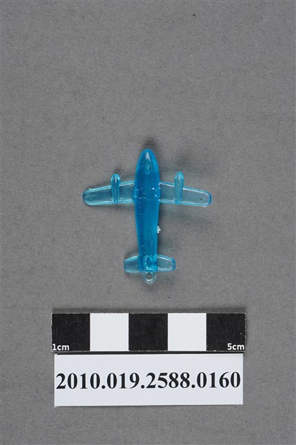 1.本件物為飛機造型尪仔仙,為藍色透明的塑膠材質。外型為飛機造型,機身為飛彈型,兩側機翼各有一發動機,機身有些微磨痕,左側有射出痕,設有尾翼及一圓環。機腹設有三個機輪,兩前輪中間有一圓形痕,機首有一氣泡。本系列尪仔仙多為相同塑膠模版,僅有顏色不同,或是同色同塑膠模版等形式。2.尪仔仙有小、中、大型之分,小型約長2公分,中型約長8-15公分左右,顏色以單色為主。長型則可長達30公分,以佛像、菩薩、神仙和唐三藏等造型為主,塗上金銀紅黃彩漆等亮色。1960、70年代的尪仔仙多以宗教、神話、布袋戲人物為造型。1980年代改以卡通、電玩、漫畫人物造型為主。常見玩法為兩人(或多人)各持一只尪仔仙,輪流用手指彈射,看誰的尪仔仙先疊在對方上面,便可贏得對方用來對戰的尪仔仙。五○年代的尪仔仙,擁有豐富的色彩,小型尪仔仙約2公分,內容包羅萬象。