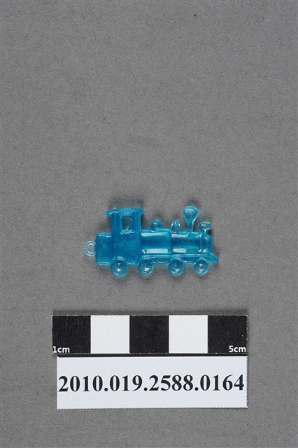 1.本件物為蒸機造型尪仔仙,為藍色透明的塑膠材質。外型為蒸氣火車頭,樣式似為臺鐵80號型蒸氣火車,車頭為車前燈、煙囪、儲氣室等構造,車體下方僅做出動輪,並無做出連結桿等細部結構,車尾有一圓環,駕駛座頂有一射出痕,車窗下方有一明顯磨痕。文物背面煙囪下方及車窗下方各有一圓形痕。本系列尪仔仙多為相同塑膠模版,僅有顏色不同,或是同色同塑膠模版等形式。2.尪仔仙有小、中、大型之分,小型約長2公分,中型約長8-15公分左右,顏色以單色為主。長型則可長達30公分,以佛像、菩薩、神仙和唐三藏等造型為主,塗上金銀紅黃彩漆等亮色。1960、70年代的尪仔仙多以宗教、神話、布袋戲人物為造型。1980年代改以卡通、電玩、漫畫人物造型為主。常見玩法為兩人(或多人)各持一只尪仔仙,輪流用手指彈射,看誰的尪仔仙先疊在對方上面,便可贏得對方用來對戰的尪仔仙。五○年代的尪仔仙,擁有豐富的色彩,小型尪仔仙約2公分,內容包羅萬象。