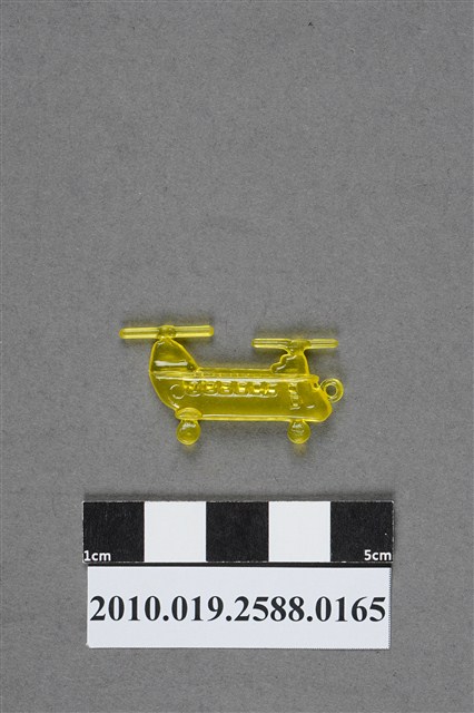 1.本件物為雙螺旋槳直升機造型尪仔仙,為黃色透明的塑膠材質。外型為雙螺旋槳直升機,機身上設有機艙門及窗戶,下方有兩個機輪,機鼻前有一圓環。文物反面機身尾端有一圓形痕跡。本系列尪仔仙多為相同塑膠模版,僅有顏色不同,或是同色同塑膠模版等形式。2.尪仔仙有小、中、大型之分,小型約長2公分,中型約長8-15公分左右,顏色以單色為主。長型則可長達30公分,以佛像、菩薩、神仙和唐三藏等造型為主,塗上金銀紅黃彩漆等亮色。1960、70年代的尪仔仙多以宗教、神話、布袋戲人物為造型。1980年代改以卡通、電玩、漫畫人物造型為主。常見玩法為兩人(或多人)各持一只尪仔仙,輪流用手指彈射,看誰的尪仔仙先疊在對方上面,便可贏得對方用來對戰的尪仔仙。五○年代的尪仔仙,擁有豐富的色彩,小型尪仔仙約2公分,內容包羅萬象。