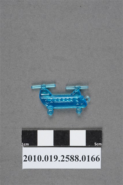 1.本件物為雙螺旋槳直升機造型尪仔仙,為藍色透明的塑膠材質。外型為雙螺旋槳直升機,機身上設有機艙門及窗戶,下方有兩個機輪,機鼻前有一圓環。前旋槳上有一射出痕。文物反面機身尾端有一圓形痕跡。本系列尪仔仙多為相同塑膠模版,僅有顏色不同,或是同色同塑膠模版等形式。2.尪仔仙有小、中、大型之分,小型約長2公分,中型約長8-15公分左右,顏色以單色為主。長型則可長達30公分,以佛像、菩薩、神仙和唐三藏等造型為主,塗上金銀紅黃彩漆等亮色。1960、70年代的尪仔仙多以宗教、神話、布袋戲人物為造型。1980年代改以卡通、電玩、漫畫人物造型為主。常見玩法為兩人(或多人)各持一只尪仔仙,輪流用手指彈射,看誰的尪仔仙先疊在對方上面,便可贏得對方用來對戰的尪仔仙。五○年代的尪仔仙,擁有豐富的色彩,小型尪仔仙約2公分,內容包羅萬象。