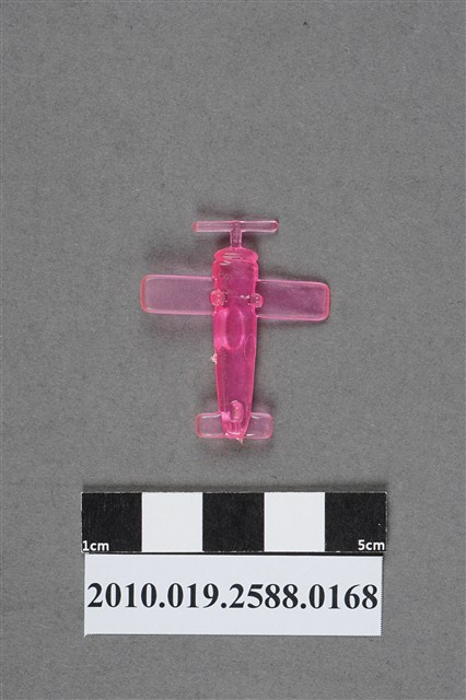 1.本件物為螺旋槳飛機造型尪仔仙,為粉紅色透明的塑膠材質。外型為螺旋槳飛機,機身可見一橢圓形機艙,右側有射出痕,近機尾左側有一片明顯磨痕。機尾有一圓環,機腹於機翼及機尾各有一突起物,應為機輪。本系列尪仔仙多為相同塑膠模版,僅有顏色不同,或是同色同塑膠模版等形式。2.尪仔仙有小、中、大型之分,小型約長2公分,中型約長8-15公分左右,顏色以單色為主。長型則可長達30公分,以佛像、菩薩、神仙和唐三藏等造型為主,塗上金銀紅黃彩漆等亮色。1960、70年代的尪仔仙多以宗教、神話、布袋戲人物為造型。1980年代改以卡通、電玩、漫畫人物造型為主。常見玩法為兩人(或多人)各持一只尪仔仙,輪流用手指彈射,看誰的尪仔仙先疊在對方上面,便可贏得對方用來對戰的尪仔仙。五○年代的尪仔仙,擁有豐富的色彩,小型尪仔仙約2公分,內容包羅萬象。