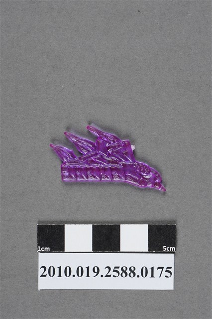 1.本件物為戰鬥機造型尪仔仙,為紫色透明的塑膠材質。外型為戰鬥機,不像一般尪仔仙為側面造型,而是斜45度視角,左前方為機首,有一隋圓形駕駛艙。中間為機身,機身左側有射出痕。機尾有一尾翼,機尾有三道噴射火焰。本系列尪仔仙多為相同塑膠模版,僅有顏色不同,或是同色同塑膠模版等形式。2.尪仔仙有小、中、大型之分,小型約長2公分,中型約長8-15公分左右,顏色以單色為主。長型則可長達30公分,以佛像、菩薩、神仙和唐三藏等造型為主,塗上金銀紅黃彩漆等亮色。1960、70年代的尪仔仙多以宗教、神話、布袋戲人物為造型。1980年代改以卡通、電玩、漫畫人物造型為主。常見玩法為兩人(或多人)各持一只尪仔仙,輪流用手指彈射,看誰的尪仔仙先疊在對方上面,便可贏得對方用來對戰的尪仔仙。五○年代的尪仔仙,擁有豐富的色彩,小型尪仔仙約2公分,內容包羅萬象。