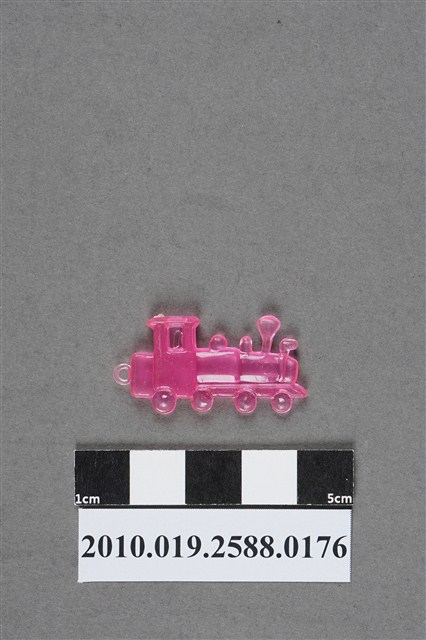 1.本件物為蒸機造型尪仔仙,為粉紅色透明的塑膠材質。外型為蒸氣火車頭,樣式似為臺鐵80號型蒸氣火車,車頭為車前燈、煙囪、儲氣室等構造,車體下方僅做出動輪,並無做出連結桿等細部結構,車尾有一圓環,駕駛座頂有一射出痕,車身有些微磨痕。文物背面煙囪下方有一圓形痕。本系列尪仔仙多為相同塑膠模版,僅有顏色不同,或是同色同塑膠模版等形式。2.尪仔仙有小、中、大型之分,小型約長2公分,中型約長8-15公分左右,顏色以單色為主。長型則可長達30公分,以佛像、菩薩、神仙和唐三藏等造型為主,塗上金銀紅黃彩漆等亮色。1960、70年代的尪仔仙多以宗教、神話、布袋戲人物為造型。1980年代改以卡通、電玩、漫畫人物造型為主。常見玩法為兩人(或多人)各持一只尪仔仙,輪流用手指彈射,看誰的尪仔仙先疊在對方上面,便可贏得對方用來對戰的尪仔仙。五○年代的尪仔仙,擁有豐富的色彩,小型尪仔仙約2公分,內容包羅萬象。