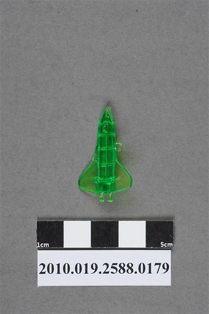 1.本件物為太空梭造型尪仔仙,為綠色透明的塑膠材質。外型為無火箭推進器的太空梭,機身切割出的六個圓柱體為軌道運行器,機尾則是發動機。機翼設於中後方,機身左側有一圓環,右側有射出痕。機腹設有三個機輪,機首及機尾各有一圓形痕。文物雙面均有磨痕。本系列尪仔仙多為相同塑膠模版,僅有顏色不同,或是同色同塑膠模版等形式。2.尪仔仙有小、中、大型之分,小型約長2公分,中型約長8-15公分左右,顏色以單色為主。長型則可長達30公分,以佛像、菩薩、神仙和唐三藏等造型為主,塗上金銀紅黃彩漆等亮色。1960、70年代的尪仔仙多以宗教、神話、布袋戲人物為造型。1980年代改以卡通、電玩、漫畫人物造型為主。常見玩法為兩人(或多人)各持一只尪仔仙,輪流用手指彈射,看誰的尪仔仙先疊在對方上面,便可贏得對方用來對戰的尪仔仙。五○年代的尪仔仙,擁有豐富的色彩,小型尪仔仙約2公分,內容包羅萬象。