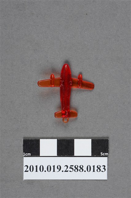 1.本件物為飛機造型尪仔仙,為紅色透明的塑膠材質。外型為飛機造型,機身為飛彈型,近機尾處有些向左彎曲,兩側機翼各有一發動機,機身左側有射出痕,設有尾翼及一圓環。機腹設有三個機輪,兩前輪中間與機尾各有一圓形痕。機身內部有一道曲折長痕。本系列尪仔仙多為相同塑膠模版,僅有顏色不同,或是同色同塑膠模版等形式。2.尪仔仙有小、中、大型之分,小型約長2公分,中型約長8-15公分左右,顏色以單色為主。長型則可長達30公分,以佛像、菩薩、神仙和唐三藏等造型為主,塗上金銀紅黃彩漆等亮色。1960、70年代的尪仔仙多以宗教、神話、布袋戲人物為造型。1980年代改以卡通、電玩、漫畫人物造型為主。常見玩法為兩人(或多人)各持一只尪仔仙,輪流用手指彈射,看誰的尪仔仙先疊在對方上面,便可贏得對方用來對戰的尪仔仙。五○年代的尪仔仙,擁有豐富的色彩,小型尪仔仙約2公分,內容包羅萬象。
