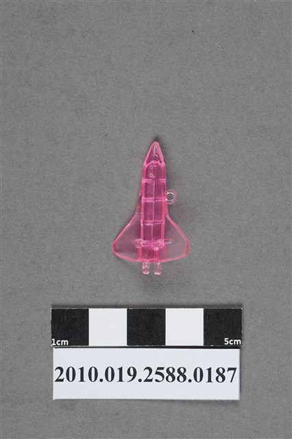 1.本件物為太空梭造型尪仔仙,為粉紅色透明的塑膠材質。外型為無火箭推進器的太空梭,機身切割出的六個圓柱體為軌道運行器,機尾則是發動機。機翼設於中後方,機身左側有一圓環。機腹設有三個機輪,機首及機尾各有一圓形痕。本系列尪仔仙多為相同塑膠模版,僅有顏色不同,或是同色同塑膠模版等形式。2.尪仔仙有小、中、大型之分,小型約長2公分,中型約長8-15公分左右,顏色以單色為主。長型則可長達30公分,以佛像、菩薩、神仙和唐三藏等造型為主,塗上金銀紅黃彩漆等亮色。1960、70年代的尪仔仙多以宗教、神話、布袋戲人物為造型。1980年代改以卡通、電玩、漫畫人物造型為主。常見玩法為兩人(或多人)各持一只尪仔仙,輪流用手指彈射,看誰的尪仔仙先疊在對方上面,便可贏得對方用來對戰的尪仔仙。五○年代的尪仔仙,擁有豐富的色彩,小型尪仔仙約2公分,內容包羅萬象。