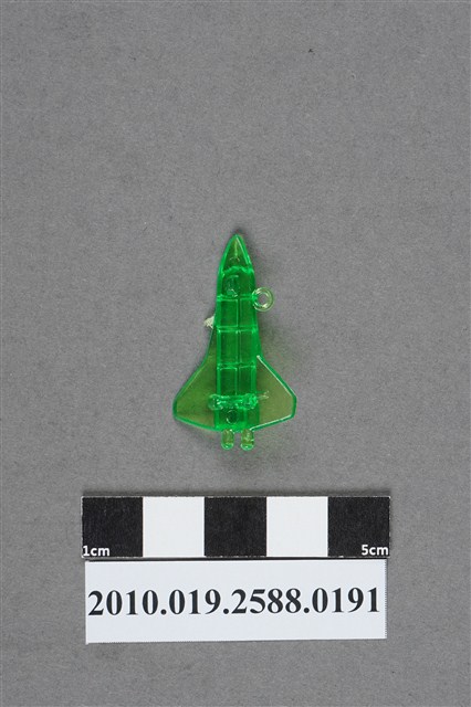 1.本件物為太空梭造型尪仔仙,為綠色透明的塑膠材質。外型為無火箭推進器的太空梭,機身切割出的六個圓柱體為軌道運行器,機尾則是發動機。機翼設於中後方,機身左側有一圓環。機腹設有三個機輪,機首及機尾各有一圓形痕。本系列尪仔仙多為相同塑膠模版,僅有顏色不同,或是同色同塑膠模版等形式。2.尪仔仙有小、中、大型之分,小型約長2公分,中型約長8-15公分左右,顏色以單色為主。長型則可長達30公分,以佛像、菩薩、神仙和唐三藏等造型為主,塗上金銀紅黃彩漆等亮色。1960、70年代的尪仔仙多以宗教、神話、布袋戲人物為造型。1980年代改以卡通、電玩、漫畫人物造型為主。常見玩法為兩人(或多人)各持一只尪仔仙,輪流用手指彈射,看誰的尪仔仙先疊在對方上面,便可贏得對方用來對戰的尪仔仙。五○年代的尪仔仙,擁有豐富的色彩,小型尪仔仙約2公分,內容包羅萬象。