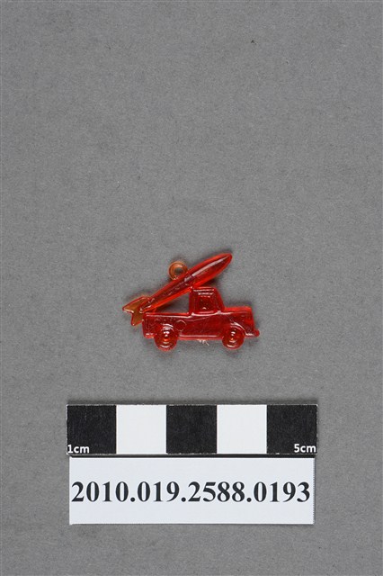 1.本件物為飛彈車造型尪仔仙,為紅色透明的塑膠材質。外型為一貨車,車斗上斜置一枚飛彈,車身下方有射出痕。文物反面車斗與飛彈彈身各有一圓形痕。文物雙面均有明顯磨痕。本系列尪仔仙多為相同塑膠模版,僅有顏色不同,或是同色同塑膠模版等形式。2.尪仔仙有小、中、大型之分,小型約長2公分,中型約長8-15公分左右,顏色以單色為主。長型則可長達30公分,以佛像、菩薩、神仙和唐三藏等造型為主,塗上金銀紅黃彩漆等亮色。1960、70年代的尪仔仙多以宗教、神話、布袋戲人物為造型。1980年代改以卡通、電玩、漫畫人物造型為主。常見玩法為兩人(或多人)各持一只尪仔仙,輪流用手指彈射,看誰的尪仔仙先疊在對方上面,便可贏得對方用來對戰的尪仔仙。五○年代的尪仔仙,擁有豐富的色彩,小型尪仔仙約2公分,內容包羅萬象。