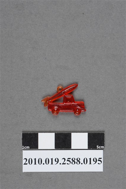 1.本件物為飛彈車造型尪仔仙,為紅色透明的塑膠材質。外型為一貨車,車斗上斜置一枚飛彈,飛彈上方有一圓環,車身下方有射出痕。文物反面車斗與飛彈彈身各有一圓形痕。文物雙面均有明顯磨痕。本系列尪仔仙多為相同塑膠模版,僅有顏色不同,或是同色同塑膠模版等形式。2.尪仔仙有小、中、大型之分,小型約長2公分,中型約長8-15公分左右,顏色以單色為主。長型則可長達30公分,以佛像、菩薩、神仙和唐三藏等造型為主,塗上金銀紅黃彩漆等亮色。1960、70年代的尪仔仙多以宗教、神話、布袋戲人物為造型。1980年代改以卡通、電玩、漫畫人物造型為主。常見玩法為兩人(或多人)各持一只尪仔仙,輪流用手指彈射,看誰的尪仔仙先疊在對方上面,便可贏得對方用來對戰的尪仔仙。五○年代的尪仔仙,擁有豐富的色彩,小型尪仔仙約2公分,內容包羅萬象。