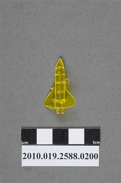 1.本件物為太空梭造型尪仔仙,為黃色透明的塑膠材質。外型為無火箭推進器的太空梭,機身切割出的六個圓柱體為軌道運行器,機尾則是發動機。機翼設於中後方,機身左側有一圓環,右側有射出痕。機腹設有三個機輪,機首及機尾各有一圓形痕,後輪處有一道黑色細痕。本系列尪仔仙多為相同塑膠模版,僅有顏色不同,或是同色同塑膠模版等形式。2.尪仔仙有小、中、大型之分,小型約長2公分,中型約長8-15公分左右,顏色以單色為主。長型則可長達30公分,以佛像、菩薩、神仙和唐三藏等造型為主,塗上金銀紅黃彩漆等亮色。1960、70年代的尪仔仙多以宗教、神話、布袋戲人物為造型。1980年代改以卡通、電玩、漫畫人物造型為主。常見玩法為兩人(或多人)各持一只尪仔仙,輪流用手指彈射,看誰的尪仔仙先疊在對方上面,便可贏得對方用來對戰的尪仔仙。五○年代的尪仔仙,擁有豐富的色彩,小型尪仔仙約2公分,內容包羅萬象。