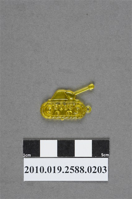 1.本件物為戰車造型尪仔仙,為黃色透明的塑膠材質。外型為戰車,炮塔左側為炮管,下方為履帶,履帶內有動輪與路輪,履帶左側有一圓環,下方有射出痕。本系列尪仔仙多為相同塑膠模版,僅有顏色不同,或是同色同塑膠模版等形式。2.尪仔仙有小、中、大型之分,小型約長2公分,中型約長8-15公分左右,顏色以單色為主。長型則可長達30公分,以佛像、菩薩、神仙和唐三藏等造型為主,塗上金銀紅黃彩漆等亮色。1960、70年代的尪仔仙多以宗教、神話、布袋戲人物為造型。1980年代改以卡通、電玩、漫畫人物造型為主。常見玩法為兩人(或多人)各持一只尪仔仙,輪流用手指彈射,看誰的尪仔仙先疊在對方上面,便可贏得對方用來對戰的尪仔仙。