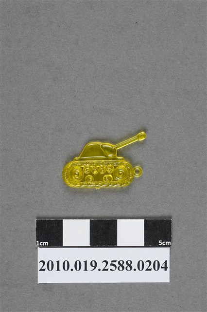 1.本件物為戰車造型尪仔仙,為黃色透明的塑膠材質。外型為戰車,炮塔左側為炮管,下方為履帶,履帶內有動輪與路輪,履帶左側有一圓環,下方有射出痕。本系列尪仔仙多為相同塑膠模版,僅有顏色不同,或是同色同塑膠模版等形式。2.尪仔仙有小、中、大型之分,小型約長2公分,中型約長8-15公分左右,顏色以單色為主。長型則可長達30公分,以佛像、菩薩、神仙和唐三藏等造型為主,塗上金銀紅黃彩漆等亮色。1960、70年代的尪仔仙多以宗教、神話、布袋戲人物為造型。1980年代改以卡通、電玩、漫畫人物造型為主。常見玩法為兩人(或多人)各持一只尪仔仙,輪流用手指彈射,看誰的尪仔仙先疊在對方上面,便可贏得對方用來對戰的尪仔仙。