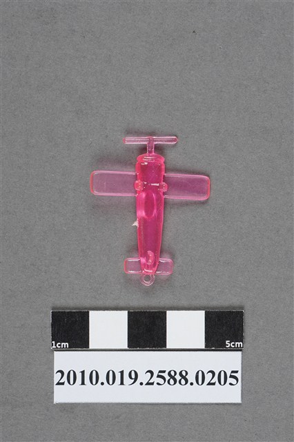 1.本件物為螺旋槳飛機造型尪仔仙,為粉紅色透明的塑膠材質。外型為螺旋槳飛機,機身可見一橢圓形機艙,右側有射出痕。機尾有一圓環,機腹於機翼及機尾各有一突起物,應為機輪。本文物雙面均有磨損痕跡。本系列尪仔仙多為相同塑膠模版,僅有顏色不同,或是同色同塑膠模版等形式。2.尪仔仙有小、中、大型之分,小型約長2公分,中型約長8-15公分左右,顏色以單色為主。長型則可長達30公分,以佛像、菩薩、神仙和唐三藏等造型為主,塗上金銀紅黃彩漆等亮色。1960、70年代的尪仔仙多以宗教、神話、布袋戲人物為造型。1980年代改以卡通、電玩、漫畫人物造型為主。常見玩法為兩人(或多人)各持一只尪仔仙,輪流用手指彈射,看誰的尪仔仙先疊在對方上面,便可贏得對方用來對戰的尪仔仙。