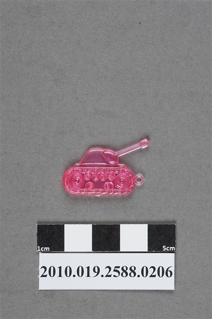 1.本件物為戰車造型尪仔仙,為粉紅色透明的塑膠材質。外型為戰車,炮塔左側為炮管,下方為履帶,履帶內有動輪與路輪,履帶左側有一圓環,下方有射出痕。本系列尪仔仙多為相同塑膠模版,僅有顏色不同,或是同色同塑膠模版等形式。2.尪仔仙有小、中、大型之分,小型約長2公分,中型約長8-15公分左右,顏色以單色為主。長型則可長達30公分,以佛像、菩薩、神仙和唐三藏等造型為主,塗上金銀紅黃彩漆等亮色。1960、70年代的尪仔仙多以宗教、神話、布袋戲人物為造型。1980年代改以卡通、電玩、漫畫人物造型為主。常見玩法為兩人(或多人)各持一只尪仔仙,輪流用手指彈射,看誰的尪仔仙先疊在對方上面,便可贏得對方用來對戰的尪仔仙。
