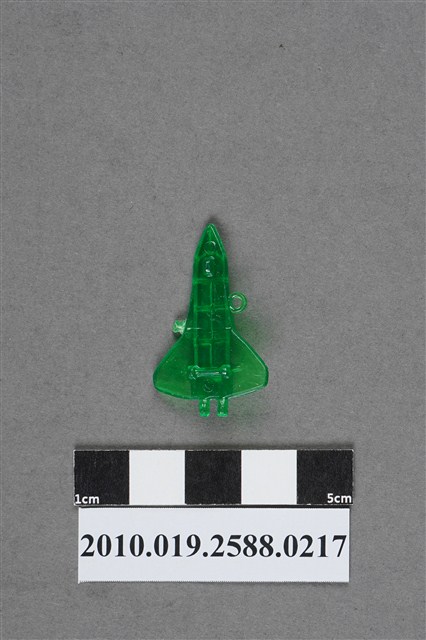 1.本件物為太空梭造型尪仔仙,為綠色透明的塑膠材質。外型為無火箭推進器的太空梭,機身切割出的六個圓柱體為軌道運行器,機尾則是發動機。機翼設於中後方,機身左側有一圓環,右側有射出痕。機腹設有三個機輪,機首及機尾各有一圓形痕。文物雙面均有磨痕。本系列尪仔仙多為相同塑膠模版,僅有顏色不同,或是同色同塑膠模版等形式。2.尪仔仙有小、中、大型之分,小型約長2公分,中型約長8-15公分左右,顏色以單色為主。長型則可長達30公分,以佛像、菩薩、神仙和唐三藏等造型為主,塗上金銀紅黃彩漆等亮色。1960、70年代的尪仔仙多以宗教、神話、布袋戲人物為造型。1980年代改以卡通、電玩、漫畫人物造型為主。常見玩法為兩人(或多人)各持一只尪仔仙,輪流用手指彈射,看誰的尪仔仙先疊在對方上面,便可贏得對方用來對戰的尪仔仙。