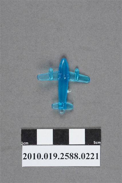 1.本件物為飛機造型尪仔仙,為藍色透明的塑膠材質。外型為飛機造型,機身為飛彈型,兩側機翼各有一發動機,機身左側有射出痕,設有尾翼及一圓環。機身與機翼有磨痕。機腹設有三個機輪,兩前輪中間與機尾各有一圓形痕。本系列尪仔仙多為相同塑膠模版,僅有顏色不同,或是同色同塑膠模版等形式。2.尪仔仙有小、中、大型之分,小型約長2公分,中型約長8-15公分左右,顏色以單色為主。長型則可長達30公分,以佛像、菩薩、神仙和唐三藏等造型為主,塗上金銀紅黃彩漆等亮色。1960、70年代的尪仔仙多以宗教、神話、布袋戲人物為造型。1980年代改以卡通、電玩、漫畫人物造型為主。常見玩法為兩人(或多人)各持一只尪仔仙,輪流用手指彈射,看誰的尪仔仙先疊在對方上面,便可贏得對方用來對戰的尪仔仙。