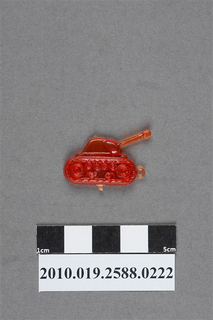 1.本件物為戰車造型尪仔仙,為紅色透明的塑膠材質。外型為戰車,炮塔左側為炮管,下方為履帶,履帶內有動輪與路輪,右側的動輪與路輪間有類似放射痕。履帶左側有一圓環,下方有射出痕。本系列尪仔仙多為相同塑膠模版,僅有顏色不同,或是同色同塑膠模版等形式。2.尪仔仙有小、中、大型之分,小型約長2公分,中型約長8-15公分左右,顏色以單色為主。長型則可長達30公分,以佛像、菩薩、神仙和唐三藏等造型為主,塗上金銀紅黃彩漆等亮色。1960、70年代的尪仔仙多以宗教、神話、布袋戲人物為造型。1980年代改以卡通、電玩、漫畫人物造型為主。常見玩法為兩人(或多人)各持一只尪仔仙,輪流用手指彈射,看誰的尪仔仙先疊在對方上面,便可贏得對方用來對戰的尪仔仙。