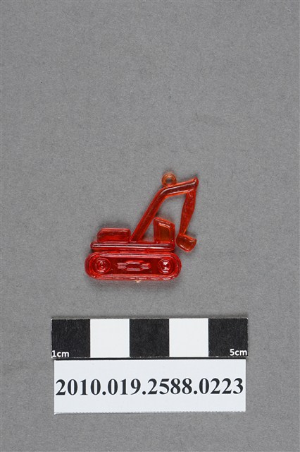 1.本件物為挖土機造型尪仔仙,為紅色透明的塑膠材質。外型為挖土機,機體有最下方的屨帶、中間的旋轉平台、駕駛座,及機械手臂和挖斗,機械手臂前臂及機械手臂後面的引擎各有一圓形痕,機械手臂後臂上有一圓環。履帶下方有射出痕。本系列尪仔仙多為相同塑膠模版,僅有顏色不同,或是同色同塑膠模版等形式。2.尪仔仙有小、中、大型之分,小型約長2公分,中型約長8-15公分左右,顏色以單色為主。長型則可長達30公分,以佛像、菩薩、神仙和唐三藏等造型為主,塗上金銀紅黃彩漆等亮色。1960、70年代的尪仔仙多以宗教、神話、布袋戲人物為造型。1980年代改以卡通、電玩、漫畫人物造型為主。常見玩法為兩人(或多人)各持一只尪仔仙,輪流用手指彈射,看誰的尪仔仙先疊在對方上面,便可贏得對方用來對戰的尪仔仙。