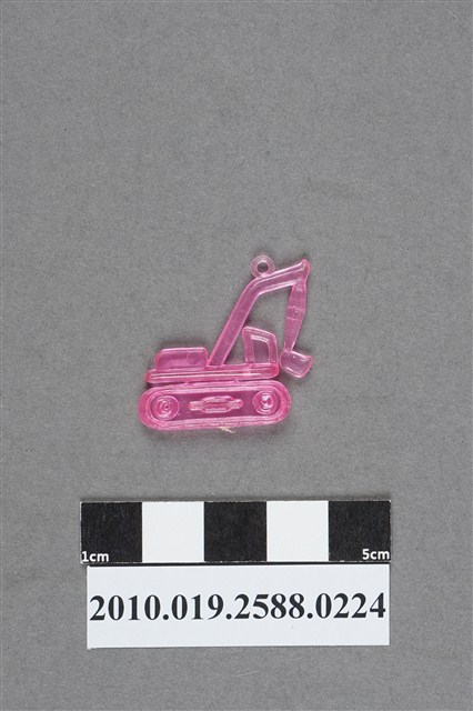 1.本件物為挖土機造型尪仔仙,為粉紅色透明的塑膠材質。外型為挖土機,機體有最下方的屨帶、中間的旋轉平台、駕駛座,及機械手臂和挖斗,機械手臂前臂及機械手臂後面的引擎各有一圓形痕,機械手臂後臂上有一圓環。履帶下方有射出痕。本系列尪仔仙多為相同塑膠模版,僅有顏色不同,或是同色同塑膠模版等形式。2.尪仔仙有小、中、大型之分,小型約長2公分,中型約長8-15公分左右,顏色以單色為主。長型則可長達30公分,以佛像、菩薩、神仙和唐三藏等造型為主,塗上金銀紅黃彩漆等亮色。1960、70年代的尪仔仙多以宗教、神話、布袋戲人物為造型。1980年代改以卡通、電玩、漫畫人物造型為主。常見玩法為兩人(或多人)各持一只尪仔仙,輪流用手指彈射,看誰的尪仔仙先疊在對方上面,便可贏得對方用來對戰的尪仔仙。