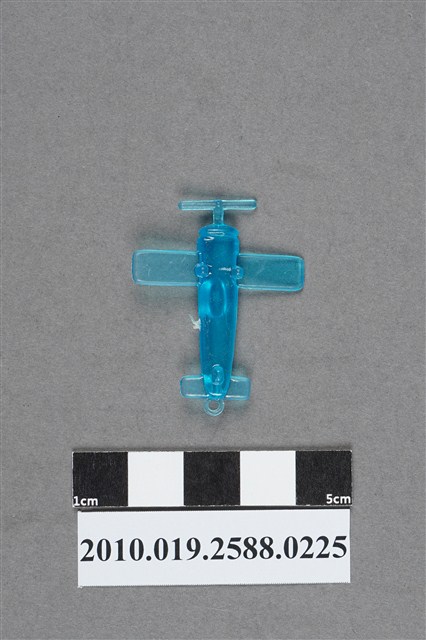 1.本件物為螺旋槳飛機造型尪仔仙,為藍色透明的塑膠材質。外型為螺旋槳飛機,機身可見一橢圓形機艙,機艙中央有一片白色磨痕,機身右側有射出痕。機尾有一圓環,機腹於機翼及機尾各有一突起物,應為機輪。本文物雙面均有磨損痕跡。本系列尪仔仙多為相同塑膠模版,僅有顏色不同,或是同色同塑膠模版等形式。2.尪仔仙有小、中、大型之分,小型約長2公分,中型約長8-15公分左右,顏色以單色為主。長型則可長達30公分,以佛像、菩薩、神仙和唐三藏等造型為主,塗上金銀紅黃彩漆等亮色。1960、70年代的尪仔仙多以宗教、神話、布袋戲人物為造型。1980年代改以卡通、電玩、漫畫人物造型為主。常見玩法為兩人(或多人)各持一只尪仔仙,輪流用手指彈射,看誰的尪仔仙先疊在對方上面,便可贏得對方用來對戰的尪仔仙。