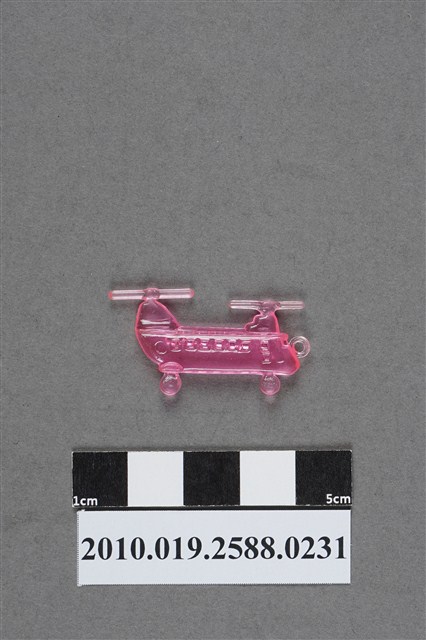 1.本件物為雙螺旋槳直升機造型尪仔仙,為粉紅色透明的塑膠材質。外型為雙螺旋槳直升機,機身上設有機艙門及窗戶,下方有兩個機輪,機鼻前有一圓環。文物反面機身尾端有一圓形痕跡。本系列尪仔仙多為相同塑膠模版,僅有顏色不同,或是同色同塑膠模版等形式。2.尪仔仙有小、中、大型之分,小型約長2公分,中型約長8-15公分左右,顏色以單色為主。長型則可長達30公分,以佛像、菩薩、神仙和唐三藏等造型為主,塗上金銀紅黃彩漆等亮色。1960、70年代的尪仔仙多以宗教、神話、布袋戲人物為造型。1980年代改以卡通、電玩、漫畫人物造型為主。常見玩法為兩人(或多人)各持一只尪仔仙,輪流用手指彈射,看誰的尪仔仙先疊在對方上面,便可贏得對方用來對戰的尪仔仙。