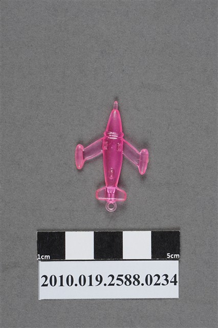 1.本件物為噴射機造型尪仔仙,為粉紅色透明的塑膠材質。外型為噴射機,左右兩側機翼尾端設有圓柱型噴射引擎,機首近機身處有一刮痕,左側噴射引擎有射出痕,機尾有一圓環。機腹有三個突起物,應為機輪,機尾有一圓形痕。本系列尪仔仙多為相同塑膠模版,僅有顏色不同,或是同色同塑膠模版等形式。2.尪仔仙有小、中、大型之分,小型約長2公分,中型約長8-15公分左右,顏色以單色為主。長型則可長達30公分,以佛像、菩薩、神仙和唐三藏等造型為主,塗上金銀紅黃彩漆等亮色。1960、70年代的尪仔仙多以宗教、神話、布袋戲人物為造型。1980年代改以卡通、電玩、漫畫人物造型為主。常見玩法為兩人(或多人)各持一只尪仔仙,輪流用手指彈射,看誰的尪仔仙先疊在對方上面,便可贏得對方用來對戰的尪仔仙。