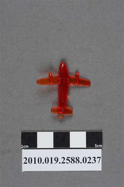 1.本件物為飛機造型尪仔仙,為紅色透明的塑膠材質。外型為飛機造型,機身為飛彈型,兩側機翼各有一發動機,機身左側有射出痕,設有尾翼及一圓環。機腹設有三個機輪,兩前輪中間與機尾各有一圓形痕,機腹近尾處有磨損痕跡。本系列尪仔仙多為相同塑膠模版,僅有顏色不同,或是同色同塑膠模版等形式。2.尪仔仙有小、中、大型之分,小型約長2公分,中型約長8-15公分左右,顏色以單色為主。長型則可長達30公分,以佛像、菩薩、神仙和唐三藏等造型為主,塗上金銀紅黃彩漆等亮色。1960、70年代的尪仔仙多以宗教、神話、布袋戲人物為造型。1980年代改以卡通、電玩、漫畫人物造型為主。常見玩法為兩人(或多人)各持一只尪仔仙,輪流用手指彈射,看誰的尪仔仙先疊在對方上面,便可贏得對方用來對戰的尪仔仙。