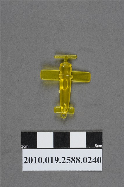 1.本件物為螺旋槳飛機造型尪仔仙,為黃色透明的塑膠材質。外型為螺旋槳飛機,機首近左側機翼處有一小氣泡。機身可見一橢圓形機艙,機艙右側及右側機翼各有一小黑點,機身右側有射出痕。機尾有一圓環,機腹於機翼及機尾各有一突起物,應為機輪。本文物雙面均有細碎磨痕。本系列尪仔仙多為相同塑膠模版,僅有顏色不同,或是同色同塑膠模版等形式。2.尪仔仙有小、中、大型之分,小型約長2公分,中型約長8-15公分左右,顏色以單色為主。長型則可長達30公分,以佛像、菩薩、神仙和唐三藏等造型為主,塗上金銀紅黃彩漆等亮色。1960、70年代的尪仔仙多以宗教、神話、布袋戲人物為造型。1980年代改以卡通、電玩、漫畫人物造型為主。常見玩法為兩人(或多人)各持一只尪仔仙,輪流用手指彈射,看誰的尪仔仙先疊在對方上面,便可贏得對方用來對戰的尪仔仙。