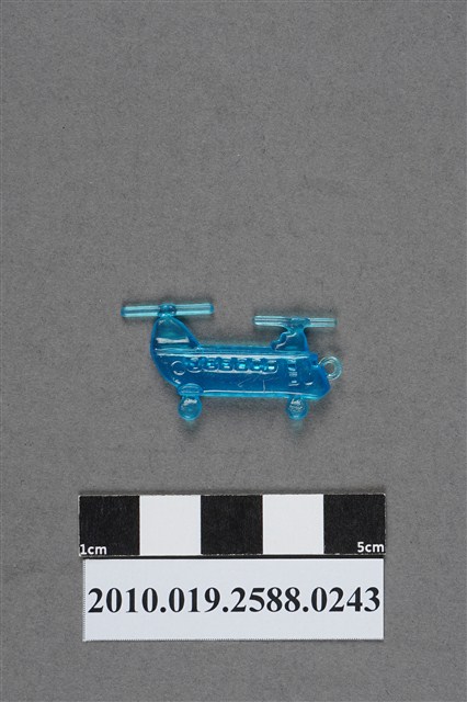 1.本件物為雙螺旋槳直升機造型尪仔仙,為藍色透明的塑膠材質。外型為雙螺旋槳直升機。機身上設有機艙門及窗戶,下方有兩個機輪,機鼻前有一圓環。文物反面機身尾端有一圓形痕跡。文物兩面均有磨痕。本系列尪仔仙多為相同塑膠模版,僅有顏色不同,或是同色同塑膠模版等形式。2.尪仔仙有小、中、大型之分,小型約長2公分,中型約長8-15公分左右,顏色以單色為主。長型則可長達30公分,以佛像、菩薩、神仙和唐三藏等造型為主,塗上金銀紅黃彩漆等亮色。1960、70年代的尪仔仙多以宗教、神話、布袋戲人物為造型。1980年代改以卡通、電玩、漫畫人物造型為主。常見玩法為兩人(或多人)各持一只尪仔仙,輪流用手指彈射,看誰的尪仔仙先疊在對方上面,便可贏得對方用來對戰的尪仔仙。