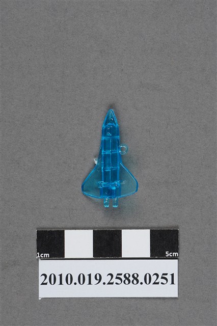 1.本件物為太空梭造型尪仔仙,為藍色透明的塑膠材質。外型為無火箭推進器的太空梭,機身切割出的六個圓柱體為軌道運行器,機尾則是發動機。機翼設於中後方,機身左側有一圓環,右側有射出痕。機腹設有三個機輪,機首及機尾各有一圓形痕。本系列尪仔仙多為相同塑膠模版,僅有顏色不同,或是同色同塑膠模版等形式。2.尪仔仙有小、中、大型之分,小型約長2公分,中型約長8-15公分左右,顏色以單色為主。長型則可長達30公分,以佛像、菩薩、神仙和唐三藏等造型為主,塗上金銀紅黃彩漆等亮色。1960、70年代的尪仔仙多以宗教、神話、布袋戲人物為造型。1980年代改以卡通、電玩、漫畫人物造型為主。常見玩法為兩人(或多人)各持一只尪仔仙,輪流用手指彈射,看誰的尪仔仙先疊在對方上面,便可贏得對方用來對戰的尪仔仙。