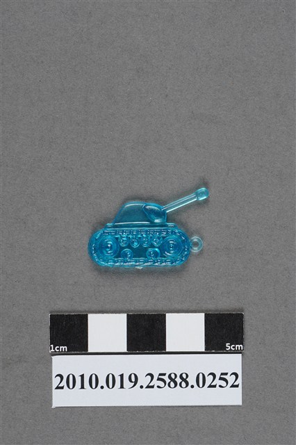 1.本件物為戰車造型尪仔仙,為藍色透明的塑膠材質。外型為戰車,炮塔左側為炮管。下方為履帶,履帶內有動輪與路輪。履帶左側有一圓環,下方有射出痕。本系列尪仔仙多為相同塑膠模版,僅有顏色不同,或是同色同塑膠模版等形式。2.尪仔仙有小、中、大型之分,小型約長2公分,中型約長8-15公分左右,顏色以單色為主。長型則可長達30公分,以佛像、菩薩、神仙和唐三藏等造型為主,塗上金銀紅黃彩漆等亮色。1960、70年代的尪仔仙多以宗教、神話、布袋戲人物為造型。1980年代改以卡通、電玩、漫畫人物造型為主。常見玩法為兩人(或多人)各持一只尪仔仙,輪流用手指彈射,看誰的尪仔仙先疊在對方上面,便可贏得對方用來對戰的尪仔仙。