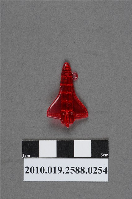 1.本件物為太空梭造型尪仔仙,為紅色透明的塑膠材質。外型為無火箭推進器的太空梭,機首有鋸齒形花紋,機身切割出的六個圓柱體為軌道運行器,左側第四個及右側第一個各有一圓形痕,機首左側有一圓環,機尾則為發動機。兩側機側外緣有點狀線裝飾,機腹設有機輪,軌道運行器右側第四個有一圓形痕。本系列尪仔仙多為相同塑膠模版,僅有顏色不同,或是同色同塑膠模版等形式。2.尪仔仙有小、中、大型之分,小型約長2公分,中型約長8-15公分左右,顏色以單色為主。長型則可長達30公分,以佛像、菩薩、神仙和唐三藏等造型為主,塗上金銀紅黃彩漆等亮色。1960、70年代的尪仔仙多以宗教、神話、布袋戲人物為造型。1980年代改以卡通、電玩、漫畫人物造型為主。常見玩法為兩人(或多人)各持一只尪仔仙,輪流用手指彈射,看誰的尪仔仙先疊在對方上面,便可贏得對方用來對戰的尪仔仙。