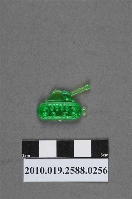 1.本件物為戰車造型尪仔仙,為綠色透明的塑膠材質。外型為戰車,炮塔左側為炮管,炮塔右上有一射出痕。下方為履帶,履帶內有動輪與路輪。履帶左側有一圓環,下方有射出痕。本系列尪仔仙多為相同塑膠模版,僅有顏色不同,或是同色同塑膠模版等形式。2.尪仔仙有小、中、大型之分,小型約長2公分,中型約長8-15公分左右,顏色以單色為主。長型則可長達30公分,以佛像、菩薩、神仙和唐三藏等造型為主,塗上金銀紅黃彩漆等亮色。1960、70年代的尪仔仙多以宗教、神話、布袋戲人物為造型。1980年代改以卡通、電玩、漫畫人物造型為主。常見玩法為兩人(或多人)各持一只尪仔仙,輪流用手指彈射,看誰的尪仔仙先疊在對方上面,便可贏得對方用來對戰的尪仔仙。
