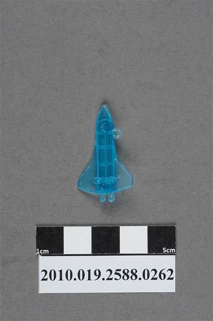 1.本件物為太空梭造型尪仔仙,為藍色透明的塑膠材質。外型為無火箭推進器的太空梭,機身切割出的六個圓柱體為軌道運行器,機尾則是發動機。機翼設於中後方,機身左側有一圓環,右側有射出痕。機腹設有三個機輪,機首及機尾各有一圓形痕。本文物雙面均有細碎磨痕。本系列尪仔仙多為相同塑膠模版,僅有顏色不同,或是同色同塑膠模版等形式。2.尪仔仙有小、中、大型之分,小型約長2公分,中型約長8-15公分左右,顏色以單色為主。長型則可長達30公分,以佛像、菩薩、神仙和唐三藏等造型為主,塗上金銀紅黃彩漆等亮色。1960、70年代的尪仔仙多以宗教、神話、布袋戲人物為造型。1980年代改以卡通、電玩、漫畫人物造型為主。常見玩法為兩人(或多人)各持一只尪仔仙,輪流用手指彈射,看誰的尪仔仙先疊在對方上面,便可贏得對方用來對戰的尪仔仙。