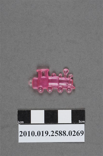 1.本件物為蒸機造型尪仔仙,為粉紅色透明的塑膠材質。外型為蒸氣火車頭,樣式似為臺鐵80號型蒸氣火車,車頭為車前燈、煙囪、儲氣室等構造,車體下方僅做出動輪,並無做出連結桿等細部結構,車尾有一圓環,車窗似有破洞痕跡。文物背面煙囪下方有一圓形痕。本文物雙面均有明顯磨痕。本系列尪仔仙多為相同塑膠模版,僅有顏色不同,或是同色同塑膠模版等形式。2.尪仔仙有小、中、大型之分,小型約長2公分,中型約長8-15公分左右,顏色以單色為主。長型則可長達30公分,以佛像、菩薩、神仙和唐三藏等造型為主,塗上金銀紅黃彩漆等亮色。1960、70年代的尪仔仙多以宗教、神話、布袋戲人物為造型。1980年代改以卡通、電玩、漫畫人物造型為主。常見玩法為兩人(或多人)各持一只尪仔仙,輪流用手指彈射,看誰的尪仔仙先疊在對方上面,便可贏得對方用來對戰的尪仔仙。