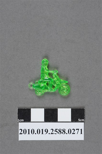 1.本件物為機車造型尪仔仙,為綠色透明的塑膠材質。外型為駕駛騎乘機車,駕駛頭戴安全帽,手握龍頭,依長髮及高跟鞋特徵,駕駛應為女性。機車後方為一圓環,駕駛身上有一圓形痕,車頭置物處及座椅下方有疑似大氣泡痕,依比例來看,前輪較後輪大。2.尪仔仙有小、中、大型之分,小型約長2公分,中型約長8-15公分左右,顏色以單色為主。長型則可長達30公分,以佛像、菩薩、神仙和唐三藏等造型為主,塗上金銀紅黃彩漆等亮色。1960、70年代的尪仔仙多以宗教、神話、布袋戲人物為造型。1980年代改以卡通、電玩、漫畫人物造型為主。常見玩法為兩人(或多人)各持一只尪仔仙,輪流用手指彈射,看誰的尪仔仙先疊在對方上面,便可贏得對方用來對戰的尪仔仙。