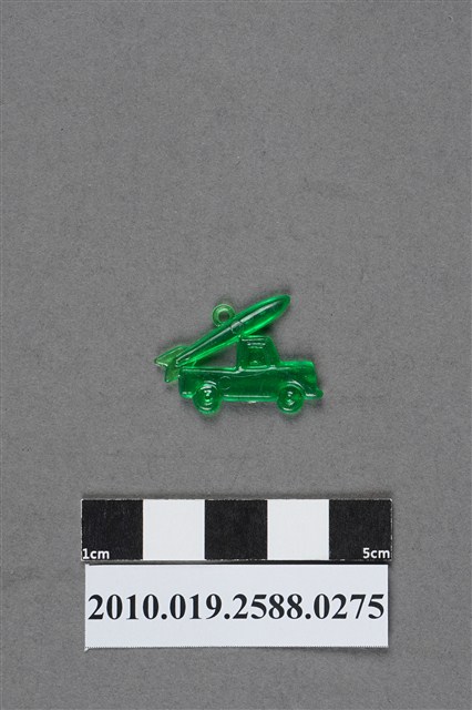 1.本件物為飛彈車造型尪仔仙,為綠色透明的塑膠材質。外型為一貨車,車斗上斜置一枚飛彈,飛彈近彈頭處有一氣泡,彈身上方有一圓環,車身下方有射出痕。文物反面車斗與飛彈彈身各有一圓形痕。文物雙面均有磨損痕跡。本系列尪仔仙多為相同塑膠模版,僅有顏色不同,或是同色同塑膠模版等形式。2.尪仔仙有小、中、大型之分,小型約長2公分,中型約長8-15公分左右,顏色以單色為主。長型則可長達30公分,以佛像、菩薩、神仙和唐三藏等造型為主,塗上金銀紅黃彩漆等亮色。1960、70年代的尪仔仙多以宗教、神話、布袋戲人物為造型。1980年代改以卡通、電玩、漫畫人物造型為主。常見玩法為兩人(或多人)各持一只尪仔仙,輪流用手指彈射,看誰的尪仔仙先疊在對方上面,便可贏得對方用來對戰的尪仔仙。