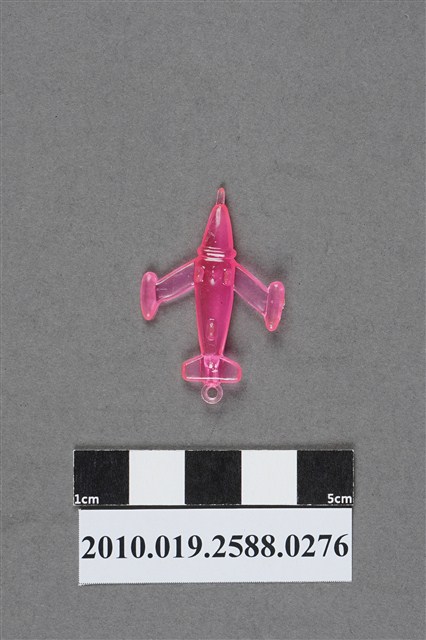 1.本件物為噴射機造型尪仔仙,為粉紅色透明的塑膠材質。外型為噴射機,左右兩側機翼尾端設有圓柱型噴射引擎,機首近機身處有一道斜痕,左側噴射引擎有射出痕,機尾有一圓環。機腹有三個突起物,應為機輪,機尾有一圓形痕。本系列尪仔仙多為相同塑膠模版,僅有顏色不同,或是同色同塑膠模版等形式。2.尪仔仙有小、中、大型之分,小型約長2公分,中型約長8-15公分左右,顏色以單色為主。長型則可長達30公分,以佛像、菩薩、神仙和唐三藏等造型為主,塗上金銀紅黃彩漆等亮色。1960、70年代的尪仔仙多以宗教、神話、布袋戲人物為造型。1980年代改以卡通、電玩、漫畫人物造型為主。常見玩法為兩人(或多人)各持一只尪仔仙,輪流用手指彈射,看誰的尪仔仙先疊在對方上面,便可贏得對方用來對戰的尪仔仙。