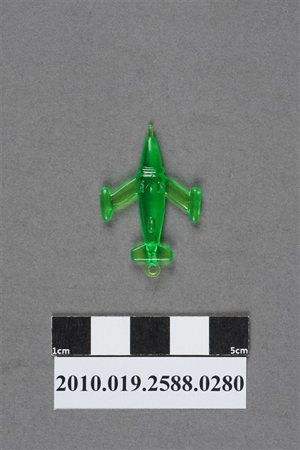 1.本件物為噴射機造型尪仔仙,為綠色透明的塑膠材質。外型為噴射機,左右兩側機翼尾端設有圓柱型噴射引擎,機首近機身處有一道斜痕,左側噴射引擎有射出痕痕跡,機尾有一圓環。機腹有三個突起物,應為機輪,機尾有一圓形痕。本系列尪仔仙多為相同塑膠模版,僅有顏色不同,或是同色同塑膠模版等形式。2.尪仔仙有小、中、大型之分,小型約長2公分,中型約長8-15公分左右,顏色以單色為主。長型則可長達30公分,以佛像、菩薩、神仙和唐三藏等造型為主,塗上金銀紅黃彩漆等亮色。1960、70年代的尪仔仙多以宗教、神話、布袋戲人物為造型。1980年代改以卡通、電玩、漫畫人物造型為主。常見玩法為兩人(或多人)各持一只尪仔仙,輪流用手指彈射,看誰的尪仔仙先疊在對方上面,便可贏得對方用來對戰的尪仔仙。