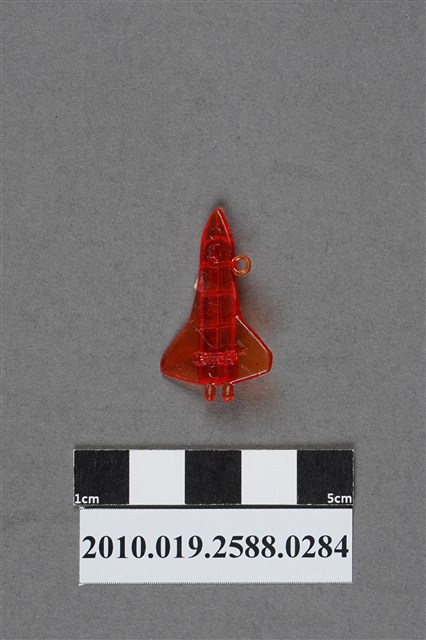 1.本件物為太空梭造型尪仔仙,為紅色透明的塑膠材質。外型為無火箭推進器的太空梭,機身切割出的六個圓柱體為軌道運行器,機尾則是發動機。機翼設於中後方,機身左側有一圓環,右側有射出痕。機腹設有三個機輪,機首及機尾各有一圓形痕,文物雙面均有磨痕。本系列尪仔仙多為相同塑膠模版,僅有顏色不同,或是同色同塑膠模版等形式。2.尪仔仙有小、中、大型之分,小型約長2公分,中型約長8-15公分左右,顏色以單色為主。長型則可長達30公分,以佛像、菩薩、神仙和唐三藏等造型為主,塗上金銀紅黃彩漆等亮色。1960、70年代的尪仔仙多以宗教、神話、布袋戲人物為造型。1980年代改以卡通、電玩、漫畫人物造型為主。常見玩法為兩人(或多人)各持一只尪仔仙,輪流用手指彈射,看誰的尪仔仙先疊在對方上面,便可贏得對方用來對戰的尪仔仙。