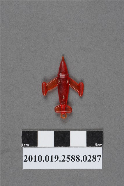 1.本件物為噴射機造型尪仔仙,為紅色透明的塑膠材質。外型為噴射機,左右兩側機翼尾端設有圓柱型噴射引擎,機首近機身處有一道斜痕,左側噴射引擎有射出痕痕跡,機尾有一圓環。機腹有三個突起物,應為機輪,三個機輪均有磨損痕跡。機尾有一圓形痕。文物雙面均有磨痕。本系列尪仔仙多為相同塑膠模版,僅有顏色不同,或是同色同塑膠模版等形式。2.尪仔仙有小、中、大型之分,小型約長2公分,中型約長8-15公分左右,顏色以單色為主。長型則可長達30公分,以佛像、菩薩、神仙和唐三藏等造型為主,塗上金銀紅黃彩漆等亮色。1960、70年代的尪仔仙多以宗教、神話、布袋戲人物為造型。1980年代改以卡通、電玩、漫畫人物造型為主。常見玩法為兩人(或多人)各持一只尪仔仙,輪流用手指彈射,看誰的尪仔仙先疊在對方上面,便可贏得對方用來對戰的尪仔仙。