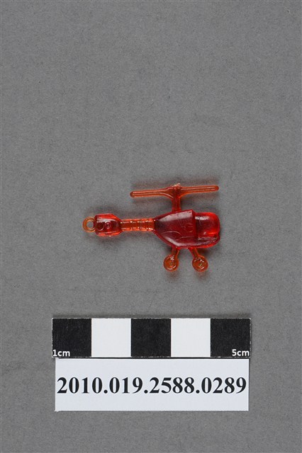 1.本件物為直升機造型尪仔仙,為紅色透明的塑膠材質。外型為直升機,機頂為主旋翼,上有射出痕。機身分為前方的駕駛艙及後方的機艙,駕駛艙為圓弧形。機尾有尾槳及一圓環,尾槳內有一圓球狀,機身下方有兩個機輪。文物背面駕駛艙後方及尾槳處各有一圓形痕,有些微磨痕。本系列尪仔仙多為相同塑膠模版,僅有顏色不同,或是同色同塑膠模版等形式。2.尪仔仙有小、中、大型之分,小型約長2公分,中型約長8-15公分左右,顏色以單色為主。長型則可長達30公分,以佛像、菩薩、神仙和唐三藏等造型為主,塗上金銀紅黃彩漆等亮色。1960、70年代的尪仔仙多以宗教、神話、布袋戲人物為造型。1980年代改以卡通、電玩、漫畫人物造型為主。常見玩法為兩人(或多人)各持一只尪仔仙,輪流用手指彈射,看誰的尪仔仙先疊在對方上面,便可贏得對方用來對戰的尪仔仙。