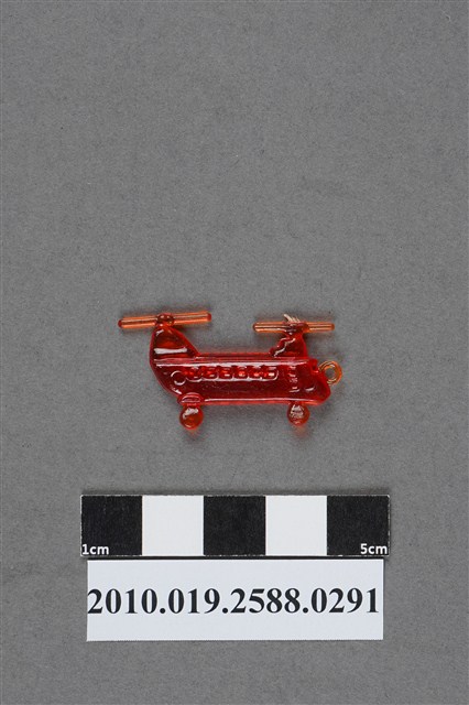 1.本件物為雙螺旋槳直升機造型尪仔仙,為紅色透明的塑膠材質。外型為雙螺旋槳直升機,前旋翼上有射出痕。機身上設有機艙門及窗戶,下方有兩個機輪。機鼻前有一圓環。文物反面機身尾端有一圓形痕跡。雙面機身均有輕微磨痕。本系列尪仔仙多為相同塑膠模版,僅有顏色不同,或是同色同塑膠模版等形式。2.尪仔仙有小、中、大型之分,小型約長2公分,中型約長8-15公分左右,顏色以單色為主。長型則可長達30公分,以佛像、菩薩、神仙和唐三藏等造型為主,塗上金銀紅黃彩漆等亮色。1960、70年代的尪仔仙多以宗教、神話、布袋戲人物為造型。1980年代改以卡通、電玩、漫畫人物造型為主。常見玩法為兩人(或多人)各持一只尪仔仙,輪流用手指彈射,看誰的尪仔仙先疊在對方上面,便可贏得對方用來對戰的尪仔仙。