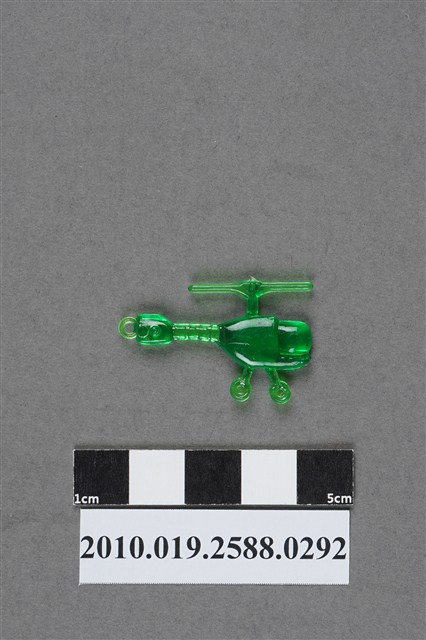 1.本件物為直升機造型尪仔仙,為綠色透明的塑膠材質。外型為直升機,機頂為主旋翼,上有射出痕。機身分為前方的駕駛艙及後方的機艙,駕駛艙為圓弧形。機尾有尾槳及一圓環,尾槳內有一圓球狀,機身下方有兩個機輪。文物背面駕駛艙後方及尾槳處各有一圓形痕。文物雙面均有些微磨痕。本系列尪仔仙多為相同塑膠模版,僅有顏色不同,或是同色同塑膠模版等形式。2.尪仔仙有小、中、大型之分,小型約長2公分,中型約長8-15公分左右,顏色以單色為主。長型則可長達30公分,以佛像、菩薩、神仙和唐三藏等造型為主,塗上金銀紅黃彩漆等亮色。1960、70年代的尪仔仙多以宗教、神話、布袋戲人物為造型。1980年代改以卡通、電玩、漫畫人物造型為主。常見玩法為兩人(或多人)各持一只尪仔仙,輪流用手指彈射,看誰的尪仔仙先疊在對方上面,便可贏得對方用來對戰的尪仔仙。