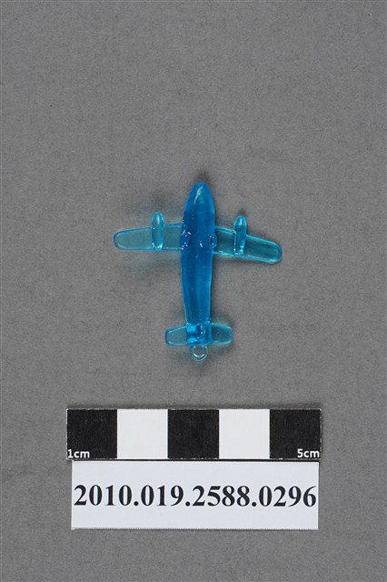 1.本件物為飛機造型尪仔仙,為藍色透明的塑膠材質。外型為飛機造型,機身為飛彈型,機尾些微向左彎曲,兩側機翼各有一發動機,機身左側有射出痕痕跡,設有尾翼及一圓環。機腹設有三個機輪,兩前輪中間與機尾各有一圓形痕。本系列尪仔仙多為相同塑膠模版,僅有顏色不同,或是同色同塑膠模版等形式。2.尪仔仙有小、中、大型之分,小型約長2公分,中型約長8-15公分左右,顏色以單色為主。長型則可長達30公分,以佛像、菩薩、神仙和唐三藏等造型為主,塗上金銀紅黃彩漆等亮色。1960、70年代的尪仔仙多以宗教、神話、布袋戲人物為造型。1980年代改以卡通、電玩、漫畫人物造型為主。常見玩法為兩人(或多人)各持一只尪仔仙,輪流用手指彈射,看誰的尪仔仙先疊在對方上面,便可贏得對方用來對戰的尪仔仙。