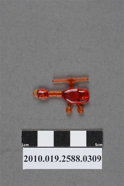 1.本件物為直升機造型尪仔仙,為紅色透明的塑膠材質。外型為直升機,機身分為前方的駕駛艙及後方的機艙,駕駛艙為圓弧形。機尾有尾槳及一圓環,尾槳內有一圓球狀,下方有未修剪之殘膠。機身下方有兩個機輪。文物背面駕駛艙後方及尾槳處各有一圓形痕。本系列尪仔仙多為相同塑膠模版,僅有顏色不同,或是同色同塑膠模版等形式。2.尪仔仙有小、中、大型之分,小型約長2公分,中型約長8-15公分左右,顏色以單色為主。長型則可長達30公分,以佛像、菩薩、神仙和唐三藏等造型為主,塗上金銀紅黃彩漆等亮色。1960、70年代的尪仔仙多以宗教、神話、布袋戲人物為造型。1980年代改以卡通、電玩、漫畫人物造型為主。常見玩法為兩人(或多人)各持一只尪仔仙,輪流用手指彈射,看誰的尪仔仙先疊在對方上面,便可贏得對方用來對戰的尪仔仙。