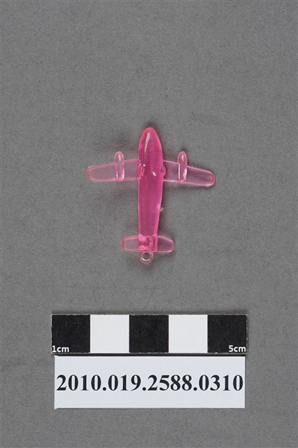 1.本件物為飛機造型尪仔仙,為粉紅色透明的塑膠材質。外型為飛機造型,機身為飛彈型,兩側機翼各有一發動機,機身左側有射出痕,設有尾翼及一圓環。機腹設有三個機輪,兩前輪中間與機尾各有一圓形痕,前輪中之圓形痕有似放射紋。本系列尪仔仙多為相同塑膠模版,僅有顏色不同,或是同色同塑膠模版等形式。2.尪仔仙有小、中、大型之分,小型約長2公分,中型約長8-15公分左右,顏色以單色為主。長型則可長達30公分,以佛像、菩薩、神仙和唐三藏等造型為主,塗上金銀紅黃彩漆等亮色。1960、70年代的尪仔仙多以宗教、神話、布袋戲人物為造型。1980年代改以卡通、電玩、漫畫人物造型為主。常見玩法為兩人(或多人)各持一只尪仔仙,輪流用手指彈射,看誰的尪仔仙先疊在對方上面,便可贏得對方用來對戰的尪仔仙。