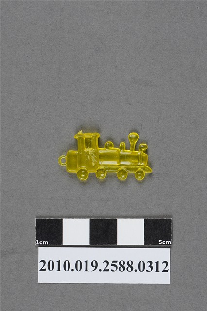 1.本件物為蒸機造型尪仔仙,為黃色透明的塑膠材質。外型為蒸氣火車頭,樣式似為臺鐵80號型蒸氣火車,車頭為車前燈、煙囪、儲氣室等構造,煙囪有一小氣泡。車體下方僅做出動輪,並無做出連結桿等細部結構。駕駛座車頂有射出痕,車尾有一圓環。文物背面煙囪下方有一圓形痕,車窗下方有一片明顯磨痕。本系列尪仔仙多為相同塑膠模版,僅有顏色不同,或是同色同塑膠模版等形式。2.尪仔仙有小、中、大型之分,小型約長2公分,中型約長8-15公分左右,顏色以單色為主。長型則可長達30公分,以佛像、菩薩、神仙和唐三藏等造型為主,塗上金銀紅黃彩漆等亮色。1960、70年代的尪仔仙多以宗教、神話、布袋戲人物為造型。1980年代改以卡通、電玩、漫畫人物造型為主。常見玩法為兩人(或多人)各持一只尪仔仙,輪流用手指彈射,看誰的尪仔仙先疊在對方上面,便可贏得對方用來對戰的尪仔仙。