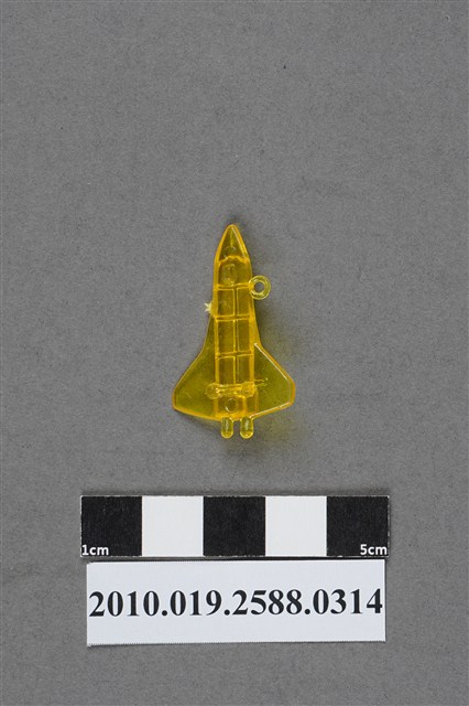 1.本件物為太空梭造型尪仔仙,為黃色透明的塑膠材質。外型為無火箭推進器的太空梭,機身切割出的六個圓柱體為軌道運行器,機尾則是發動機。機翼設於中後方,機身左側有一圓環,右側有射出痕。機腹設有三個機輪,機首及機尾各有一圓形痕。文物正反面均有磨痕。本系列尪仔仙多為相同塑膠模版,僅有顏色不同,或是同色同塑膠模版等形式。2.尪仔仙有小、中、大型之分,小型約長2公分,中型約長8-15公分左右,顏色以單色為主。長型則可長達30公分,以佛像、菩薩、神仙和唐三藏等造型為主,塗上金銀紅黃彩漆等亮色。1960、70年代的尪仔仙多以宗教、神話、布袋戲人物為造型。1980年代改以卡通、電玩、漫畫人物造型為主。常見玩法為兩人(或多人)各持一只尪仔仙,輪流用手指彈射,看誰的尪仔仙先疊在對方上面,便可贏得對方用來對戰的尪仔仙。