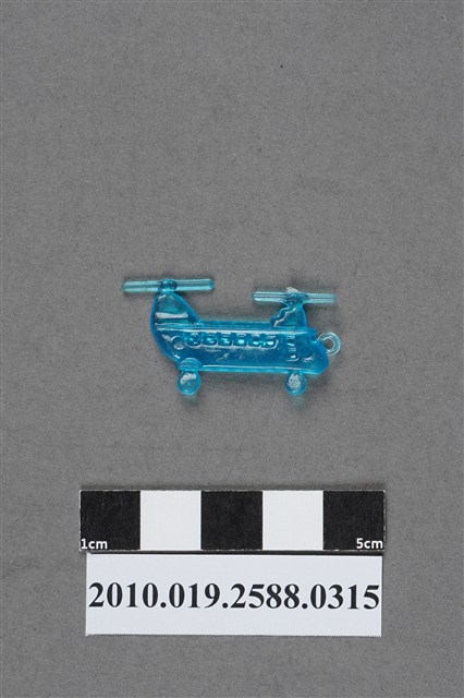 1.本件物為雙螺旋槳直升機造型尪仔仙,為藍色透明的塑膠材質。外型為雙螺旋槳直升機,前旋翼上有射出痕。機身上設有機艙門及窗戶,下方有兩個機輪。機鼻前有一圓環。文物反面機身尾端與近機鼻處各有一圓形痕跡,機身有刮痕。本系列尪仔仙多為相同塑膠模版,僅有顏色不同,或是同色同塑膠模版等形式。2.尪仔仙有小、中、大型之分,小型約長2公分,中型約長8-15公分左右,顏色以單色為主。長型則可長達30公分,以佛像、菩薩、神仙和唐三藏等造型為主,塗上金銀紅黃彩漆等亮色。1960、70年代的尪仔仙多以宗教、神話、布袋戲人物為造型。1980年代改以卡通、電玩、漫畫人物造型為主。常見玩法為兩人(或多人)各持一只尪仔仙,輪流用手指彈射,看誰的尪仔仙先疊在對方上面,便可贏得對方用來對戰的尪仔仙。